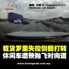 载货罗里失控侧翻打转 休闲车遭殃抛飞对向道
