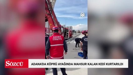 Adana'da nehirde suyun yükselmesiyle köprü ayağında mahsur kalan kedi kurtarıldı