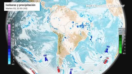 Pronóstico de isobaras y precipitación: martes 3 de Marzo.