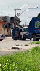 Caminhão coletor de lixo cai em buraco na Avenida Cristiano Machado