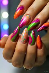 Bright neon swirl nail art in pink, green, and orange