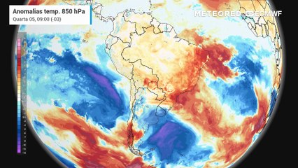 Quarta-feira, 5 de novembro: Anomalia de temperatura em 850 hPa entre quarta (5) e sexta-feira (7).