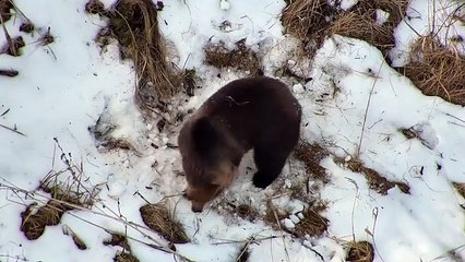 Drone camera captures bear waking up from hibernation