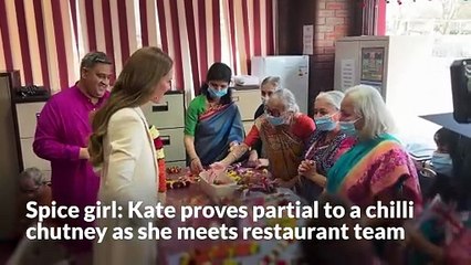 Spice girl: Kate proves partial to a chilli chutney as she meets restaurant team