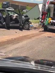 Acidente grave na BR-324 deixa carro destruído e caminhão na vala