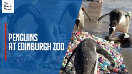 Penguins delight in painted pebbles at Edinburgh Zoo