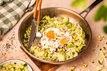 Huevos a la sartén con calabacín y aguacate
