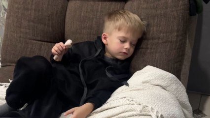 Cat surprises a boy by grabbing the item in his hand and waking him abruptly