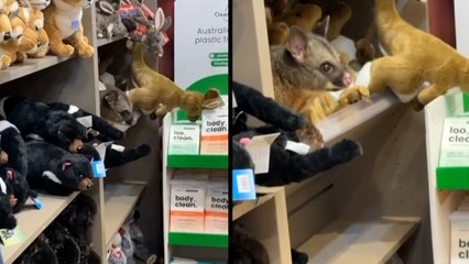 Una zarigüeya real aparece entre peluches en una tienda