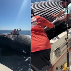 Deux pêcheurs ivres posent sur une baleine morte flottante
