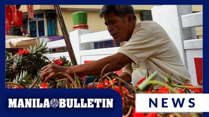 Vendor arranges and displays ube, pineapples for sale along Ongpin Street in Binondo, Manila