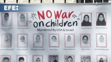 La embajada de Irán en España cuelga un cartel con fotos de niños iraníes víctimas de la guerra