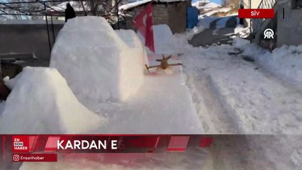 Sivas'ta bir kişi evinin önüne kardan araç ve gemi yaptı