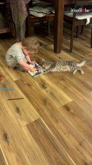 Toddler and cat share sibling rivalry vibes as playful moment unfolds at home
