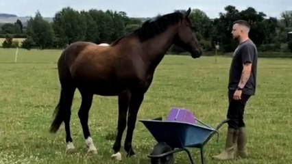 Guy tries to stand by a grumpy horse and fails really hard
