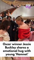 Oscar winner Jessie Buckley shares a emotional hug with her young ‘Hamnet’ co-star Jacobi Jupe at...