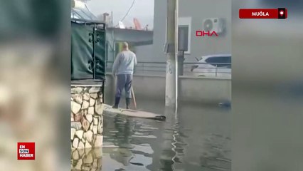 Muğla'da göle dönen yolda kano ile ilerledi