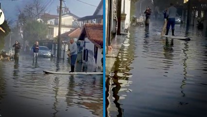 Şiddetli yağışın ardından şaşırtan görüntü! Sel sularında kano ile ilerledi