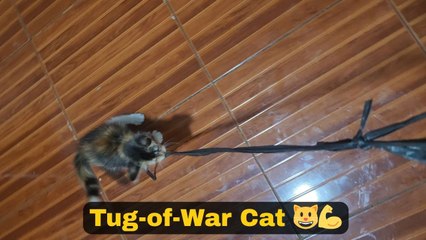 Cat turns simple task into tug of war by refusing to release rope during box tying