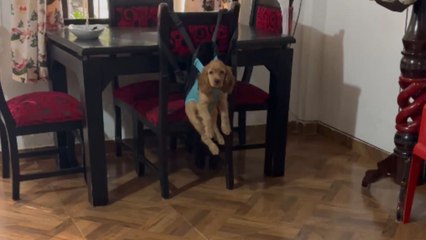 Dog remains perfectly calm while attached to dining chairs during house cleaning