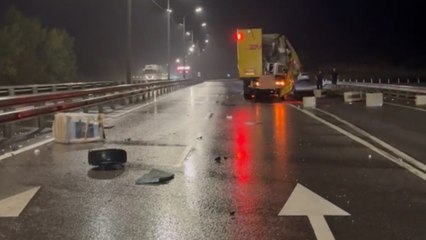 Aftermath of accident on Russian highway shows a badly damaged car and an injured person