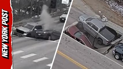 Dramatic moment sinkhole suddenly swallows two cars at intersection