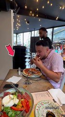 Woman watches her Hell's Kitchen pizza fall as the pan suddenly tips off the stand