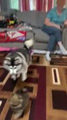 Little Pomeranian Puppy Play-fights With Adult Alaskan Klee Kai