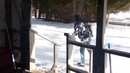Epic fall: Man slips on ice right outside his home