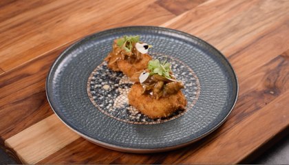 Palmito Relleno de Crema de Cerdo con Kale Frita y Salsa Verde