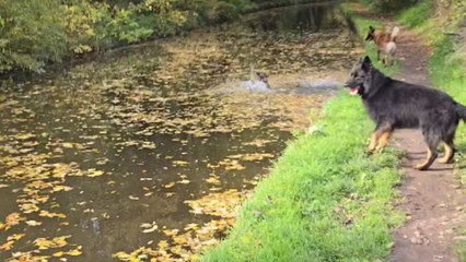 Malinois learns the hard way that canal leaves are not solid ground