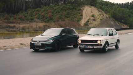 Volkswagen Golf GTI EDITION 50 in Dark Moss Green Metallic & Golf 1 GTI in Alpine White - Driving...