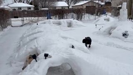 Two Pugs Play in Snowy Tunnels in Yard in Winnipeg, Canada Made by Owner