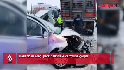 Hafif ticari araç, park halindeki kamyona çarptı
