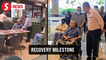Dr M enjoys iced choc drink on first outing since hip fracture